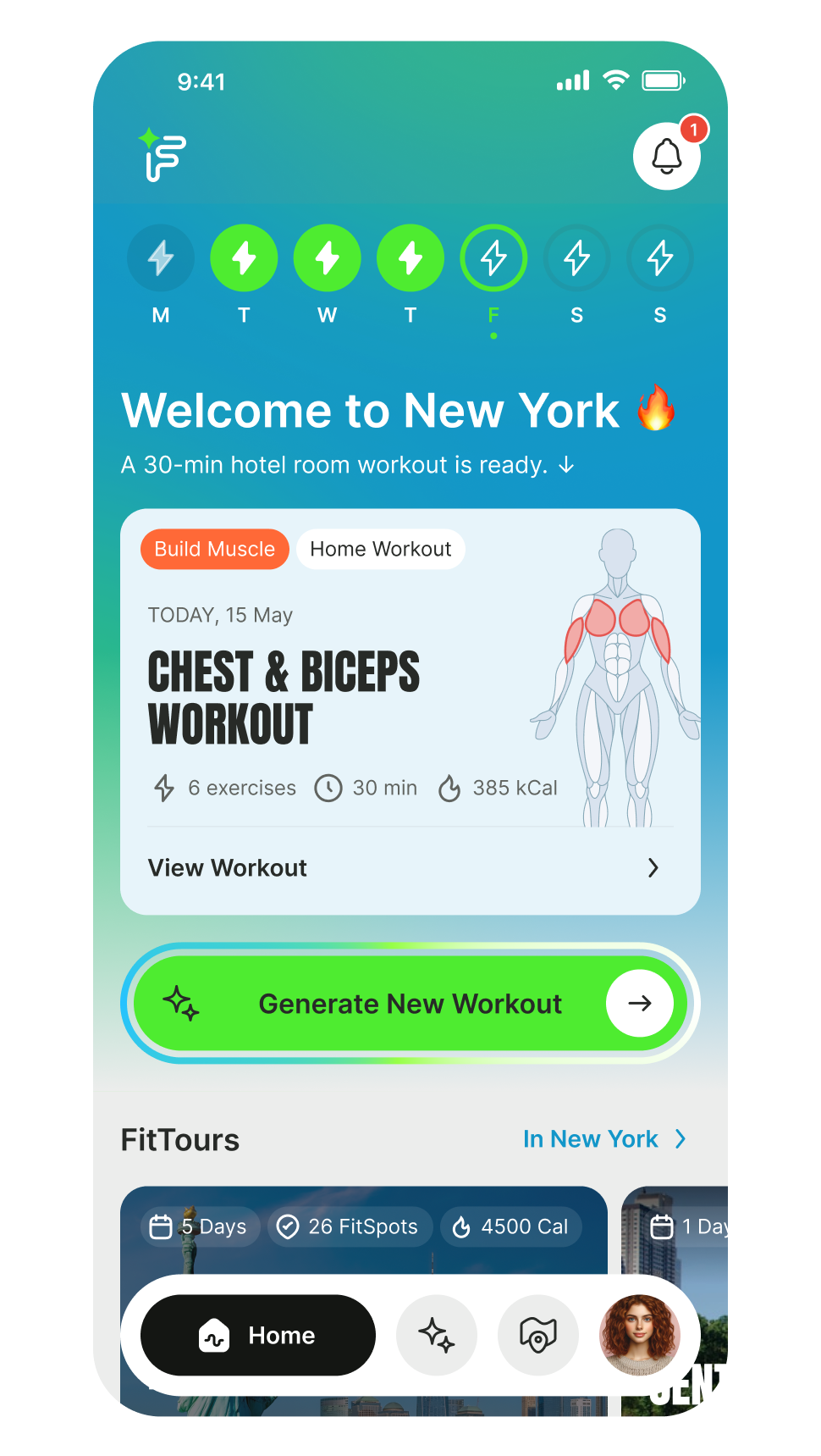 Each user’s location, fitness level, and social activity dynamically influence what the app suggests next, whether it’s an AI-generated workout in a nearby park, a local FitTour challenge, or a post-workout highlight shared with the community.