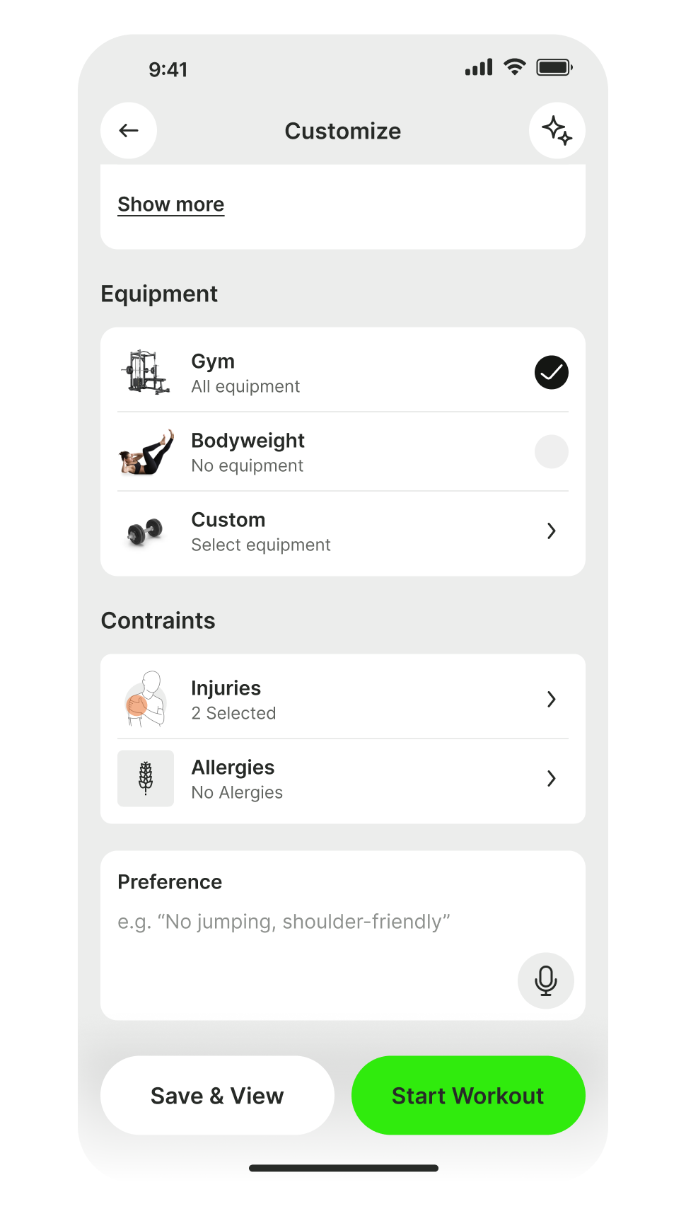 Smart, adaptive routines that respond to user goals, available equipment, and training context.